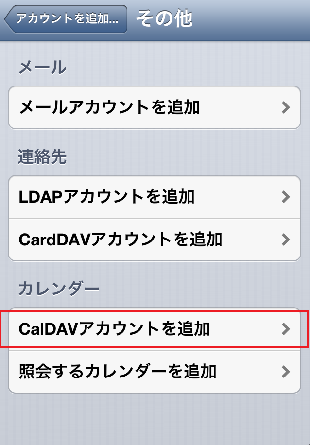 - 一番下の「その他」を選択し、カレンダーの「CalDAVアカウントを追加」を選択します。