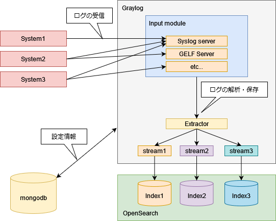 • opensearch:ログを保存する全文検索エンジンです。Graylog6.1以降では、OpenSearchは「Data Node」というコンポーネントに統合されました。