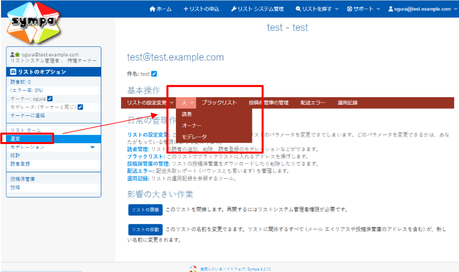 リスト管理者の管理画面に遷移するには、該当のメーリングリストの管理画面にて、画面左の「リストのオプション」→「運営」をクリックし、表示された画面内の「人」→「オーナー」をクリックします。