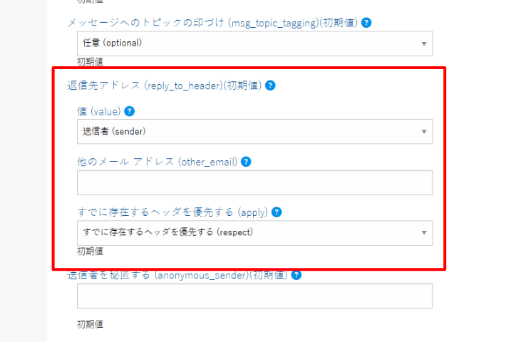 表示された画面内の「返信先アドレス」にて、リストの返信先(Reply-To: SMTP ヘッダフィールド)に指定する内容を設定します。